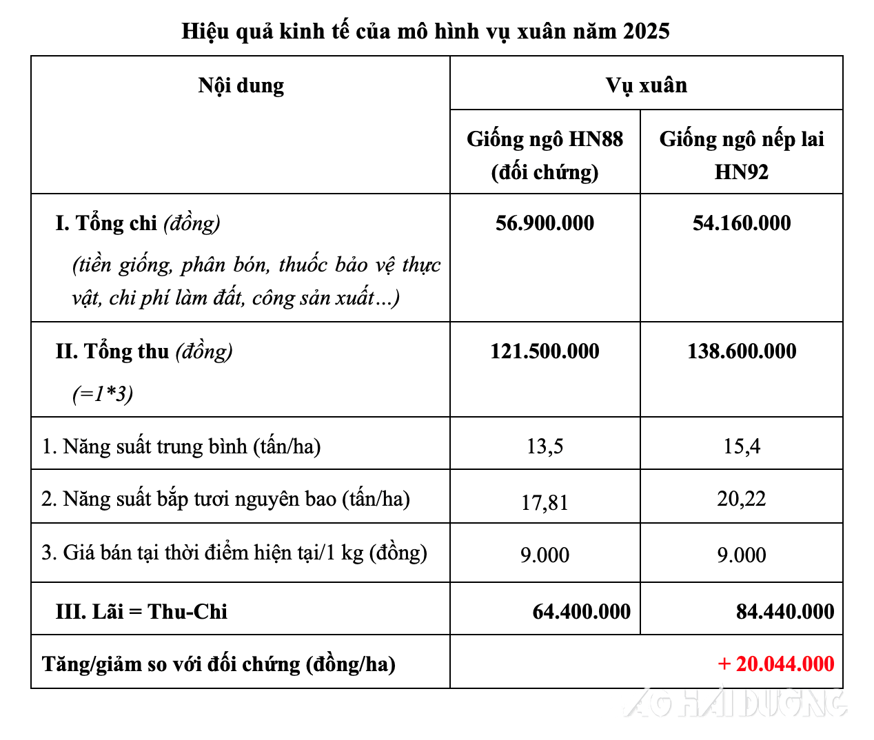 Bảng so sánh hiệu quả kinh tế giữa giống ngô nếp lai HN92 so với giống ngô đối chứng HN88